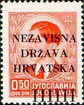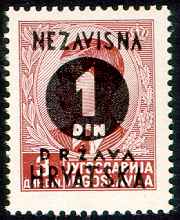| 16. 5. 1941 Pretisak NEZAVISNA DRZAVA HRVATSKA 1 DIN Overprint NEZAVISNA DRZAVA HRVATSKA 1 DIN 1 dinar (over 3 din), 23.50x30 mm, naklada/issued 3 300 000 M41 (398) |