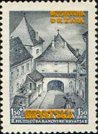 | 10. 5. 1941 Zlatni pretisak NEZAVISNA DRZAVA HRVATSKA II Filatelisticka izlozba u Zagrebu, 16.-27. 3. 1941 Zagreb: Kamenita vrata. Overprint in gold NEZAVISNA DRZAVA HRVATSKA IInd Philatelic Exhibition in Zagreb, 16.-27. 3. 1941 Zagreb: The Stone Gate. 1.50+1.50 dinar, 30x40 mm, naklada/issued 56 000 sets M39 (439) Posebnosti/Irregularities |