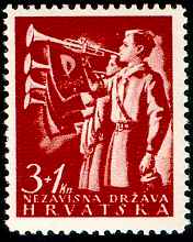 | 5. 7. 1942 Za fond "Pomoc" Trubljaci "HELP" FUND Trumpeters 3 + 1 Kuna, 29x35.5 mm, naklada/issued 140 000 M 83 |