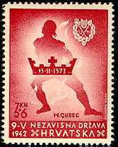 | 22. 11. 1942 SENJSKE ZRTVE (ZA USTASKU MLADEZ) Matija Gubec 15. II 1573 VICTIMS OF SENJ MASACRE Matija Gubec 15. Feb 1573 3 + 6 Kuna, 27x35 mm, naklada/issued 510 000 M 91 |