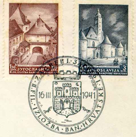 Detalj omotnice prvog dana "II Filatelisticka izlozba" u Zagrebu od 16.-27. ozujka 1941. god. Velika rijetkost: Zlatni pretisak (M39 F I) na smedu marku (M437Jug) i sa slovom "S" (M39 F II). (Nije na slici!) Detail of FDC "II Philatelic Exhibition" in Zagreb from 16-27 March 1941. Very rare: Golden overprint (M39 F I) over brown stamp (M437Jug) particularly with initial "S" (M39 F II). (Not shown!) |