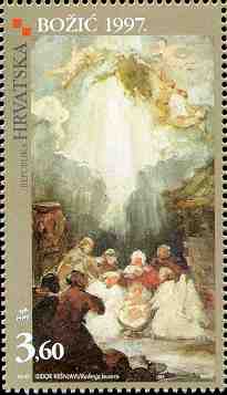 28. 11. 1997 BOZIC 1997. Isidor Krsnjavi: "Rodenje Isusovo" (oko 1890.) CHRISTMAS 1997 Isidor Krsnjavi: "Birth of Jesus" (round 1890) 3.60 kuna, 34.08x59.64 mm, naklada/issued 150 000 Autor: Danijel Popovic |