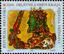 3. 7. 1997 HRVATSKI KRALJEVI 900. obljetnica smrti kralja Petra Svacica CROATIAN KINGS 900th Anniversary of the death of King Petar Svacic 1.30 kuna, 35.5x29.82 mm, naklada/issued 350 000 Autor: Eugen Kokot |