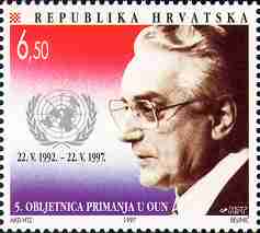 22. 5. 1997 5. OBLJETNICA PRIMANJA REPUBLIKE HRVATSKE U OUN Govor dr. Franje Tudmana u UN 5th ANNIVERSARY OF THE ADMISSION OF THE REPUBLIC OF CROATIA INTO THE UNITED NATIONS Inaugural speech of dr. Franjo Tudman in the UN 6.50 kuna, 39.76x35.5 mm, naklada/issued 150 000 Autor: Ivica Belinic |