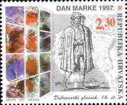 9. 9. 1997 DAN MARKE 1997 Dubrovacki glasnik, XVI. stoljece STAMP DAY 1997 The 16th century courier from Dubrovnik 2.30 kuna, 42.6x35.5 mm, naklada/issued 500 000 Autor: Nevenka Arbanas |