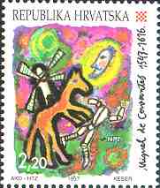 7. 2. 1997 Veliki Europljani 450. obljetnica rodenja Miguela de Cervantesa Great Europeans 450th Anniversary of the Birth of Miguel de Cervantes 2.20 kuna, 29.82x35.5 mm, naklada/issued 350 000 Autor: Zlatko Keser |