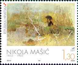 14. 11. 1997 HRVATSKO MODERNO SLIKARSTVO Nikola Masic: "Slikar u bari" (oko 1878.) CROATIAN MODERN PAINTING Nikola Masic: "Painter in the Pond" (round 1878) 1.30 kuna, 42.6x35.5 mm, naklada/issued 350 000 Autor: Danijel Popovic |