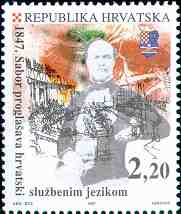 23. 10. 1997 OBLJETNICE HRVATSKOGA JEZIKA 150. obljetnica odluke Sabora o uvodenju Hrvatskoga kao sluzbenog jezika (Ivan Kukuljevic, 1847) ANNIVERSARIES OF THE CROATIAN LANGUAGE 150 years of the Croatian language in the Croatian parliament (Ivan Kukuljevic, 1847) 2.20 kuna, 29.82x35.5 mm, naklada/issued 350 000 Autor: Nevenka Arbanas |