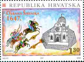 18. 9. 1997 OBRANA SIBENIKA 1647. 350. obljetnica obrane Sibenika od Turaka THE DEFENCE OF SIBENIK 1647 350th Anniversary of the defence of Sibenik against the Turks 1.30 kuna, 48.28x35.5 mm, naklada/issued 350 000 Autor: Zlatko Keser |