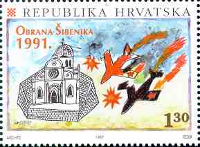 18. 9. 1997 OBRANA SIBENIKA 1991. Obrana Sibenika od Srba u Domovinskom ratu 1991. THE DEFENCE OF SIBENIK 1991 The defence of Sibenik against the Serbs in the Fatherland war in 1991 1.30 kuna, 48.28x35.5 mm, naklada/issued 350 000 Autor: Zlatko Keser |