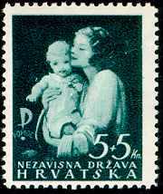 | 5. 7. 1942 Za fond "Pomoc" Majka s djetetom "HELP" FUND Mother with a child 5 + 5 Kuna, 29x35.5 mm, naklada/issued 140 000 M 85 |