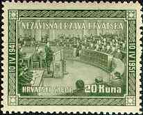 10. 4. 1951 10. godisnjica uzpostave Nezavisne Drzave Hrvatske Hrvatski sabor 22. 2. 1942. 10th anniversary of proclamation of Independent State of Croatia Croatian Parliament on February 22nd, 1942 Designer: A. Dell'Acqua 20kn, 45x39mm Printed 30,000 stamps in Buenos Aires, Argentina, (35 stamps on sheet 262x280 mm) Initials "AP" on each 31st stamp on a 20kn sheet |