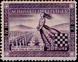 10. 4. 1951 10. godisnjica uzpostave Nezavisne Drzave Hrvatske Zarobljena domovina 10th anniversary of proclamation of Independent State of Croatia Conquered Homeland Designer: A. Dell'Acqua 30kn, 45x39mm Printed 30,000 stamps in Buenos Aires, Argentina, (35 stamps on sheet 262x280 mm) Initials "AD" on each 35th stamp on a 30kn sheet |