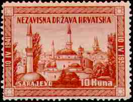 10. 4. 1951 10. godisnjica uzpostave Nezavisne Drzave Hrvatske Sarajevo 10th anniversary of proclamation of Independent State of Croatia City of Sarajevo Designer: A. Dell'Acqua 10kn, 45x39mm Printed 30,000 stamps in Buenos Aires, Argentina, (35 stamps on sheet 262x280 mm) |