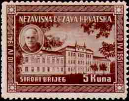 10. 4. 1951 10. godisnjica uzpostave Nezavisne Drzave Hrvatske Siroki Brijeg 10th anniversary of proclamation of Independent State of Croatia Siroki Brijeg Monastery where 28 Franciscans were tortured to death by Tito's serbian communists in 1945 Designer: A. Dell'Acqua 5kn, 45x39mm Printed 30,000 stamps in Buenos Aires, Argentina, (35 stamps on sheet 262x280 mm) |