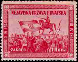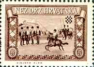 10. 4. 1951 10. godisnjica uzpostave Nezavisne Drzave Hrvatske Zagreb, Jelacicev trg 10. 4. 1941. 10th anniversary of proclamation of Independent State of Croatia Zagreb, Jelacic Square on April 10th 1941 Designer: A. Dell'Acqua 1kn, 45x39mm Printed 30,000 stamps in Buenos Aires, Argentina, (35 stamps on sheet 262x280 mm) |