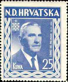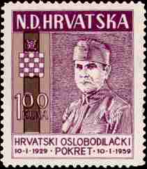 7. 1. 1959 30. godisnjica osnutka Hrvatskog Oslobodilackog Pokreta "Ustasa" Dr. Ante Pavelic, osnivac pokreta 30th anniversary of the fundation of the Croatian Liberation Movement "Ustasha". Dr. Ante Pavelic, the funder of CLM "Ustasha" Designer: J. Martinez Campos 100kn, 35x41mm Printed 25,200 stamps in Madrid, Spain, (84 stamps on sheet) Stamp donated by Dubravko Mikulic. Thank you very much Dubravko! |