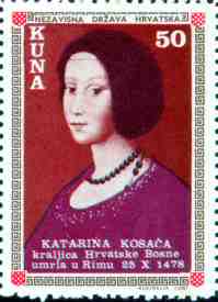 1. 4. 1980, Australia KATARINA KOSACA Kraljica Hrvatske Bosne Umrla u Rimu 25. 10. 1478. 25kn, 34x47mm Printed 6,000 stamps (1000 sheets - 6 sets in sheet - 4 stamps in set) |