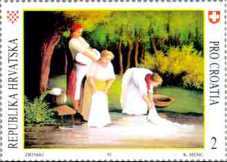 1992, Switzerland PRO CROATIA - Fund for war-stricken Croatian children VELIKANI HRVATSKE NAIVE Katarina Henc: "Tri Dravske pralje" FAMOUS CROATIAN NAIVE ARTISTS Katarina Henc: "Three Washerwomen on the Drava" 2SFr, 55x40mm (Printed simulation of perforation) |