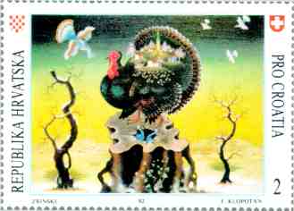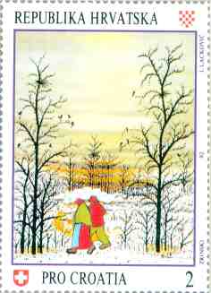 1992, Switzerland PRO CROATIA - Fund for war-stricken Croatian children VELIKANI HRVATSKE NAIVE Ivan Lackovic-Croata: "Predvecernji povratak" FAMOUS CROATIAN NAIVE ARTISTS Ivan Lackovic-Croata: "Twilight Homecoming" 2SFr, 40x55mm (Printed simulation of perforation) |