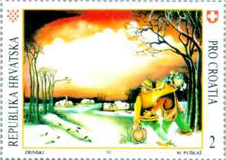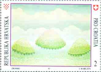 1992, Switzerland PRO CROATIA - Fund for war-stricken Croatian children VELIKANI HRVATSKE NAIVE Ivan Rabuzin: "Tri brega" FAMOUS CROATIAN NAIVE ARTISTS Ivan Rabuzin: "Three Hills" 2SFr, 55x40mm (Printed simulation of perforation) |