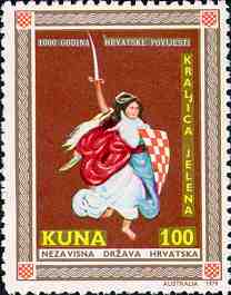 5. 4. 1979, Australia 1000 GODINA HRVATSKE POVIJESTI Kraljica Jelena 100kn, 35x45mm Printed 20,000 stamps (20 stamps on sheet - 4x5) |